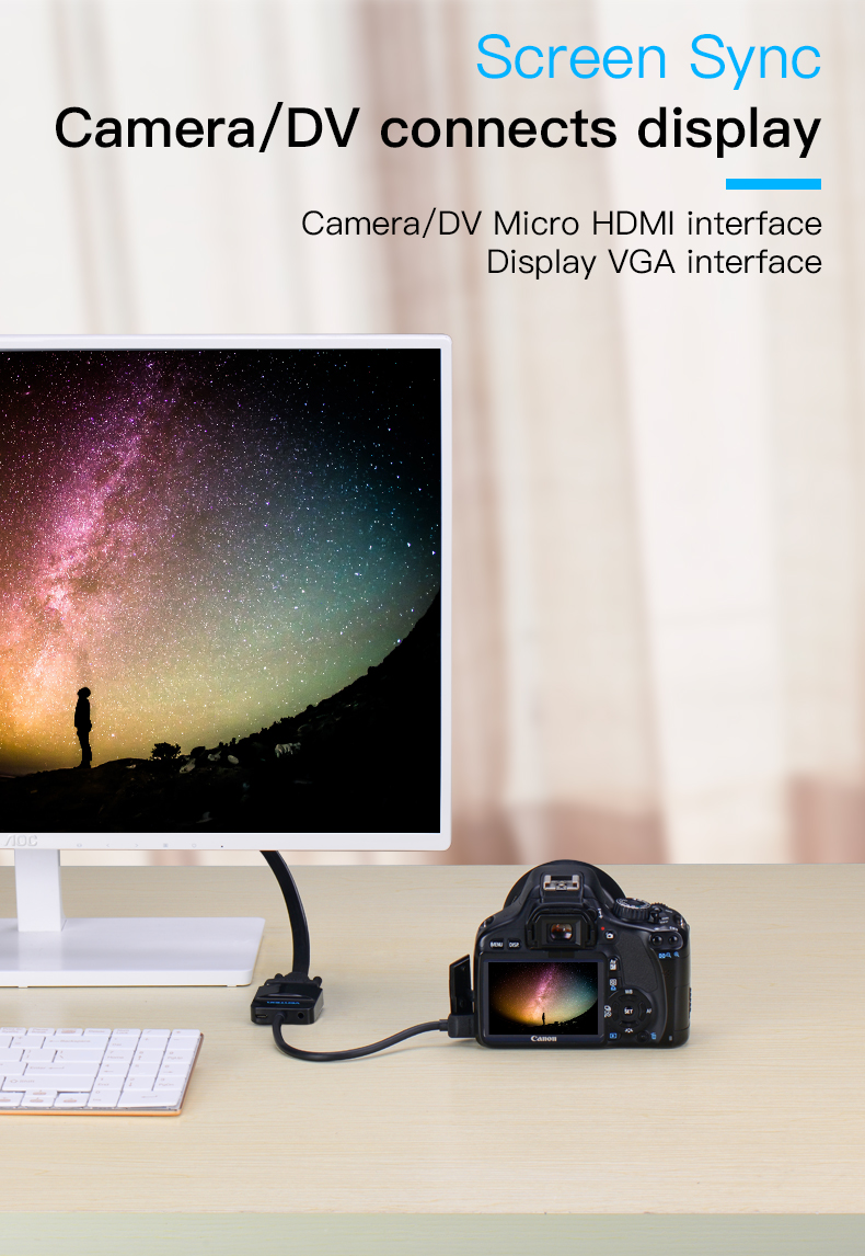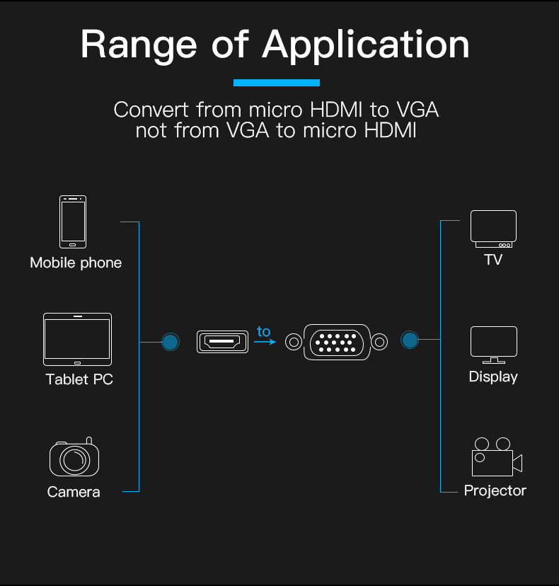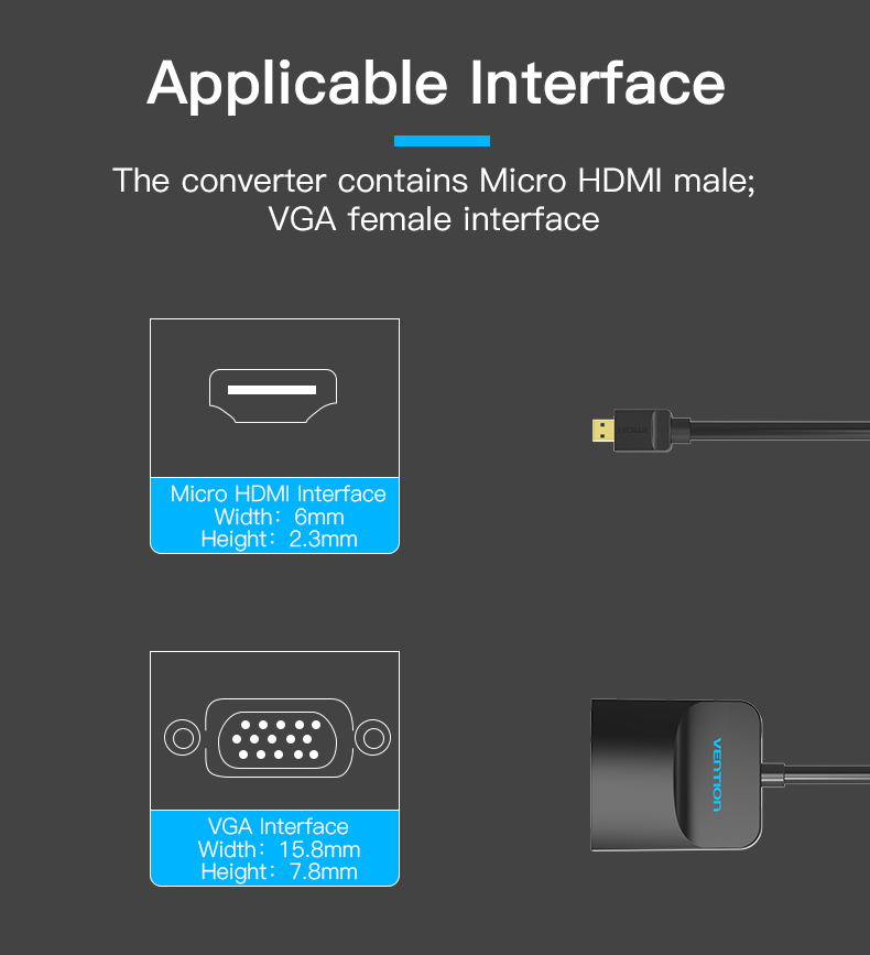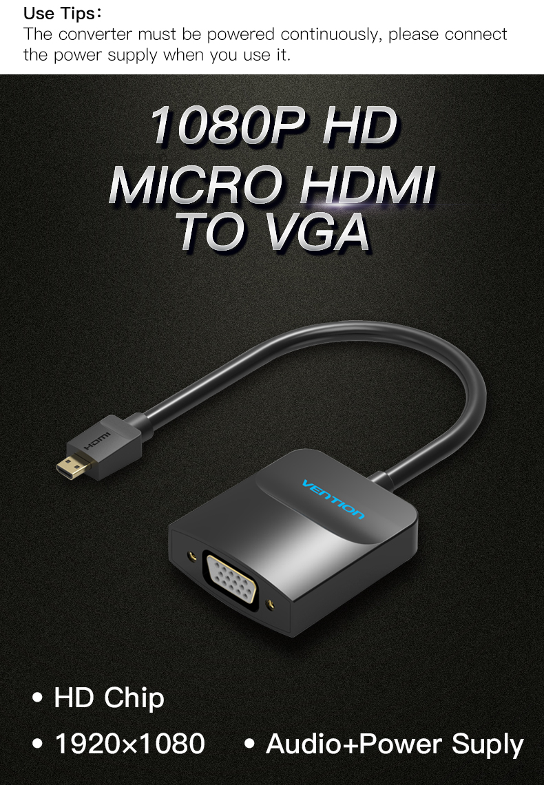 | Portas | 1* HDMI D Macho, 1* VGA Fêmea, 1* 3.5mm Fêmea, 1* USB 2.0 Micro-B Fêmea |